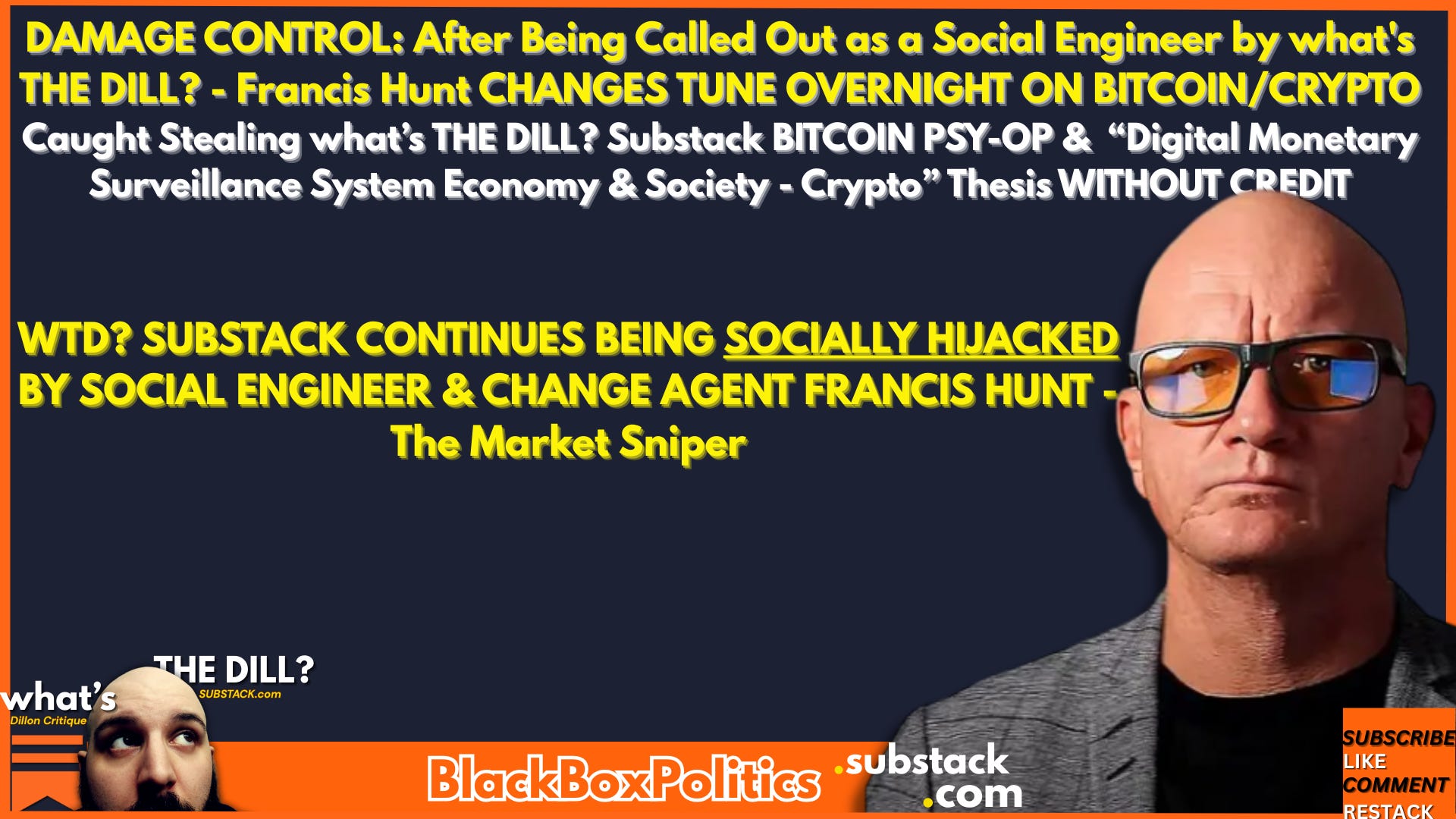 after being called and found out as a Social Engineer and Change Agent that has recently enaged in immediate damage control (documented in-depth below). reported two days ago that Francis Hunt has recently, “Change his Tune” after being called out by for stealing three of thesis, phrases and analysis and re-branding/re-labeling them while also purposely pushing citizens into World Government’s crypto/Bitcoin PSY-OP.what,