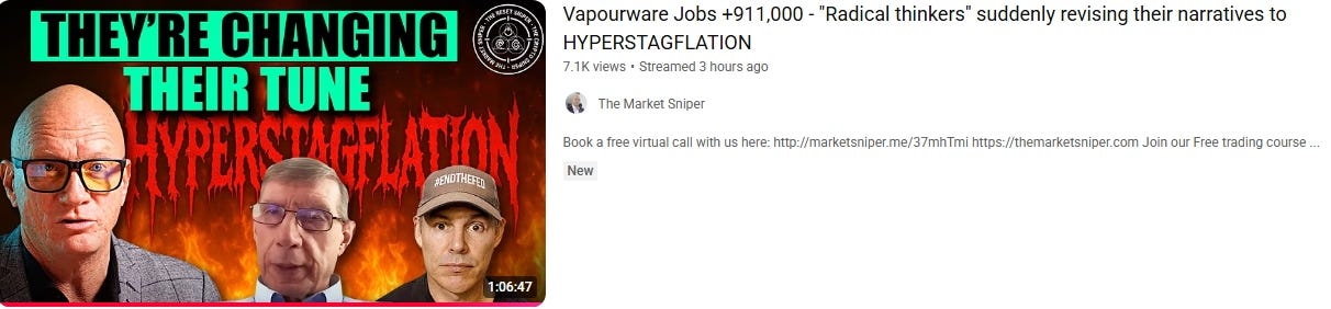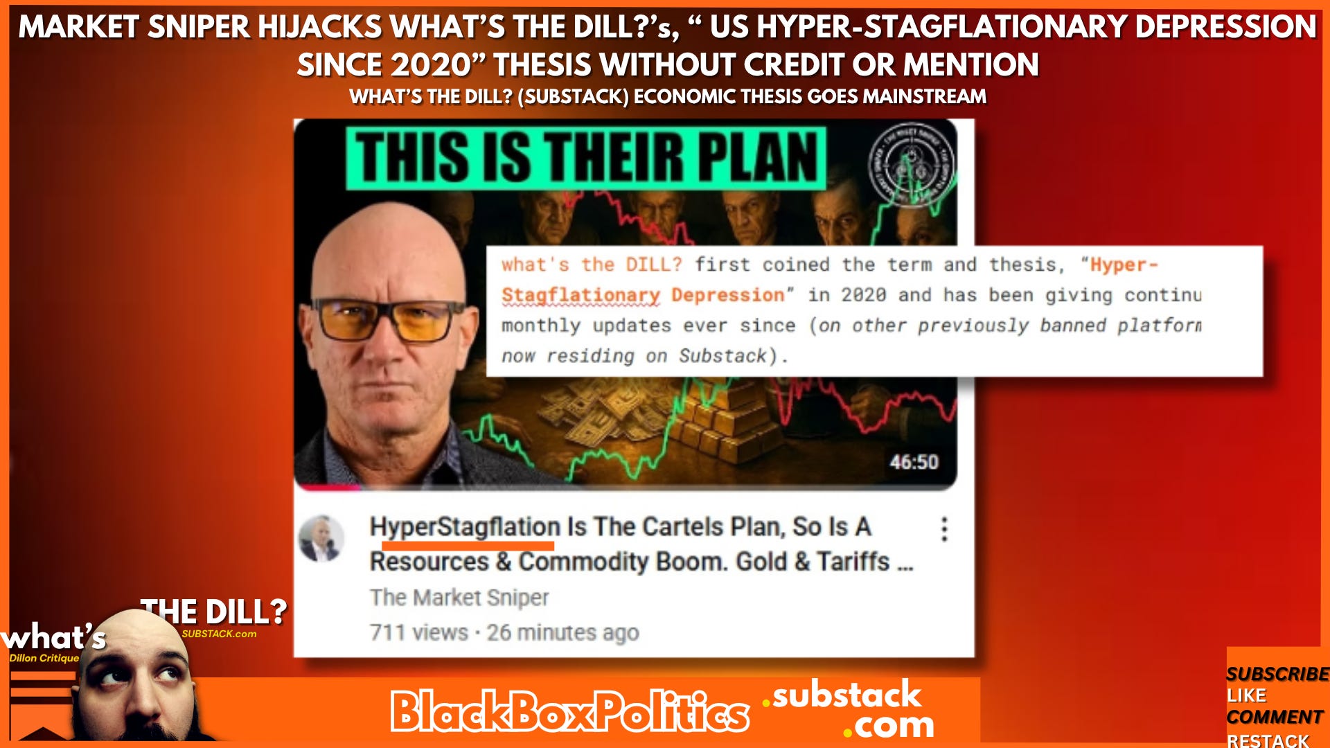 ’s original work and economic thesis of a, “Hyper-Stagflationary Depression” since 2020 to present day on Substack, Francis Hunt of, “The Market Sniper (YouTube Channel) has Hijacked economic thesis and has gone on a grand standing ovation tour in interviews telling the world and passing off ’s economic thesis as his own as a new enlightenment perspective in Finance/Economics…That’s because it is a new form of enlightenment, just not created by Francis Hunt “TheMarketSniper” himself with the macro data and continuously monthly updates to back it up.